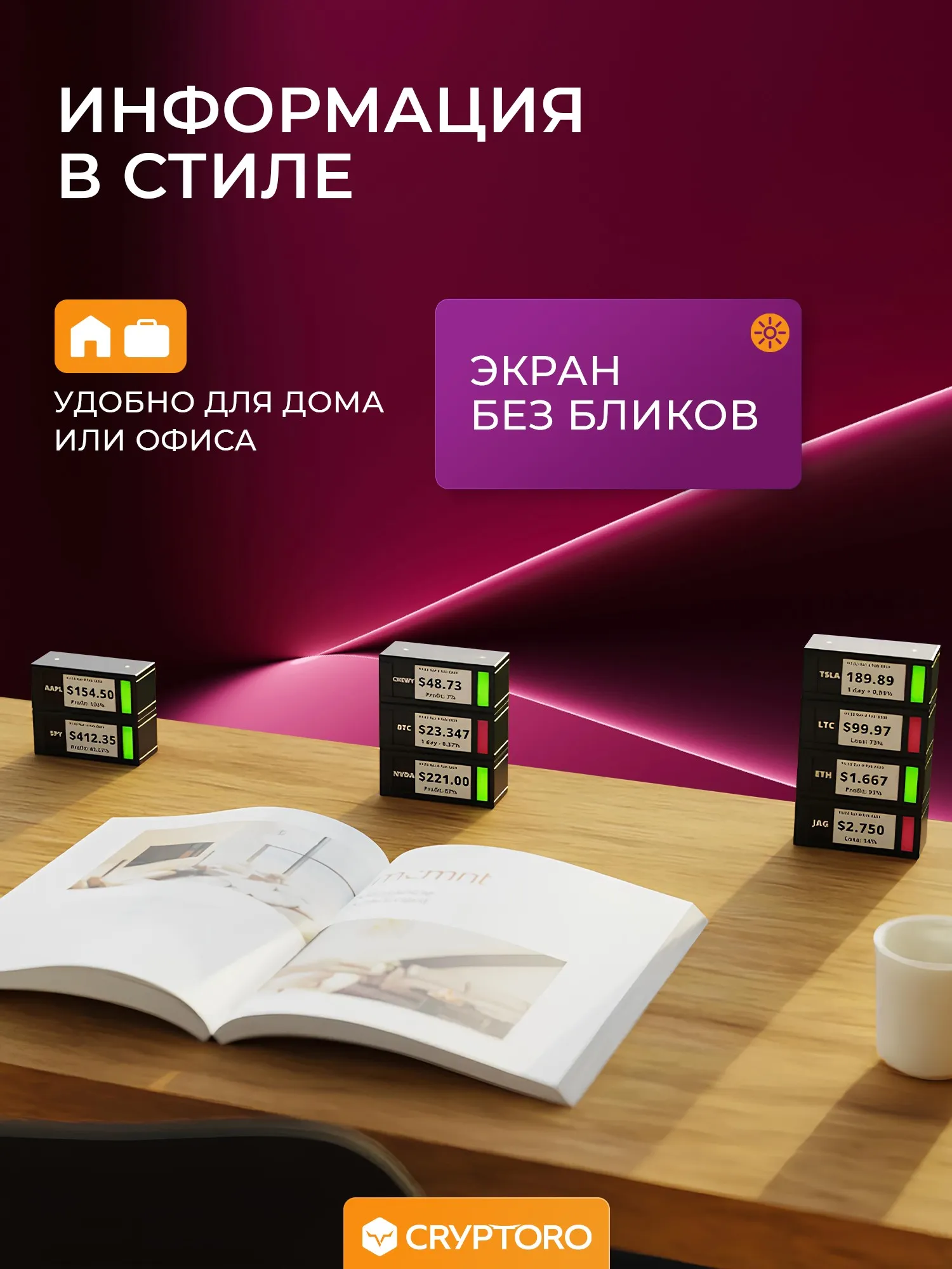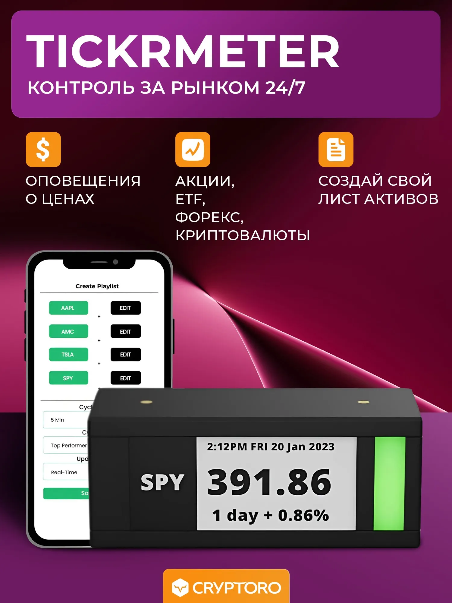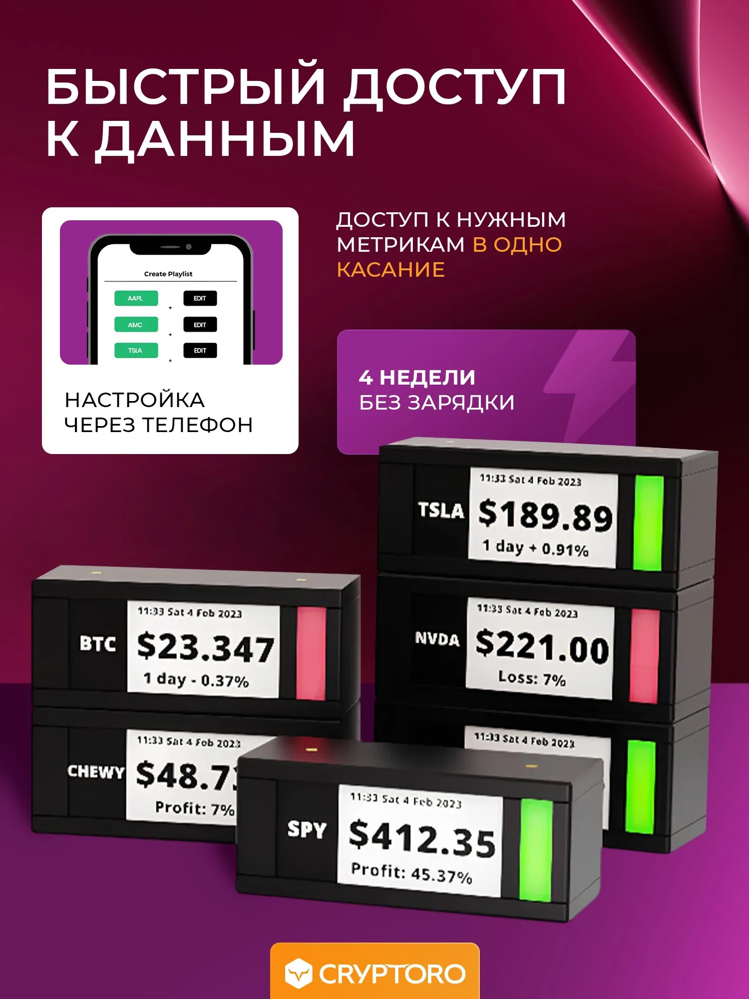 TickrMeter - это биржевой тикер, который поддерживает котировки криптовалют, акций и облигаций. Он имеет ненавязчивый дисплей электронной бумаги, который использует технологию E-Paper и не излучает света. TickrMeter также позволяет создавать плейлисты и циклически переключаться между тиккерами. Устройство подключается к Wi-Fi, что позволяет настраивать бегущую строку и другие параметры с помощью телефона. Благодаря своим компактным размерам, TickrMeter может быть установлен практически в любом месте. Он также имеет настраиваемый индикатор состояния, который отображает цвет свечи, RSI или может использоваться в качестве предупреждения. Кроме того, TickrMeter позволяет создавать свое портфолио, собирая различные тикеры. И наконец, устройство поддерживает беспроводную зарядку, что позволяет заряжать до 10 устройств по одному кабелю USB-C.