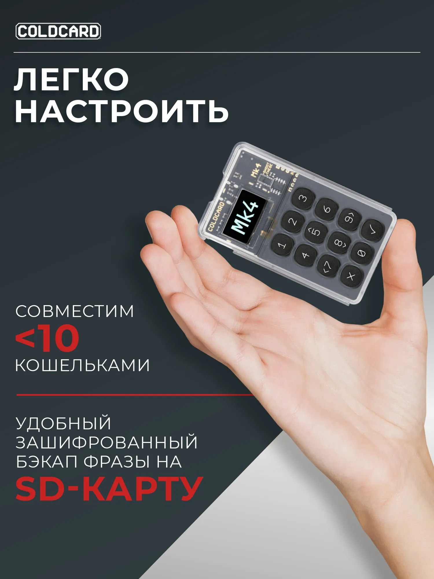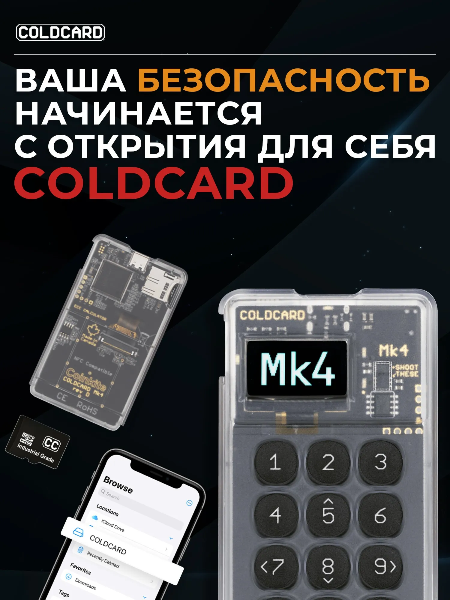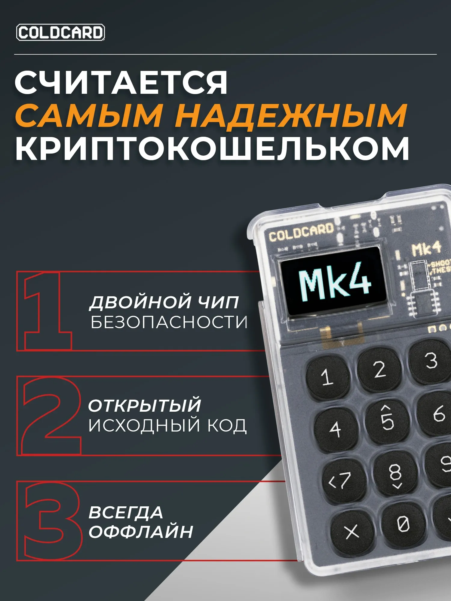Холодный кошелек Coldcard MK4  - один из наиболее известных девайсов в мире, наравне с Trezor, Coolwallet Pro, Keystone, Secux, Ellipal и Bitbox.