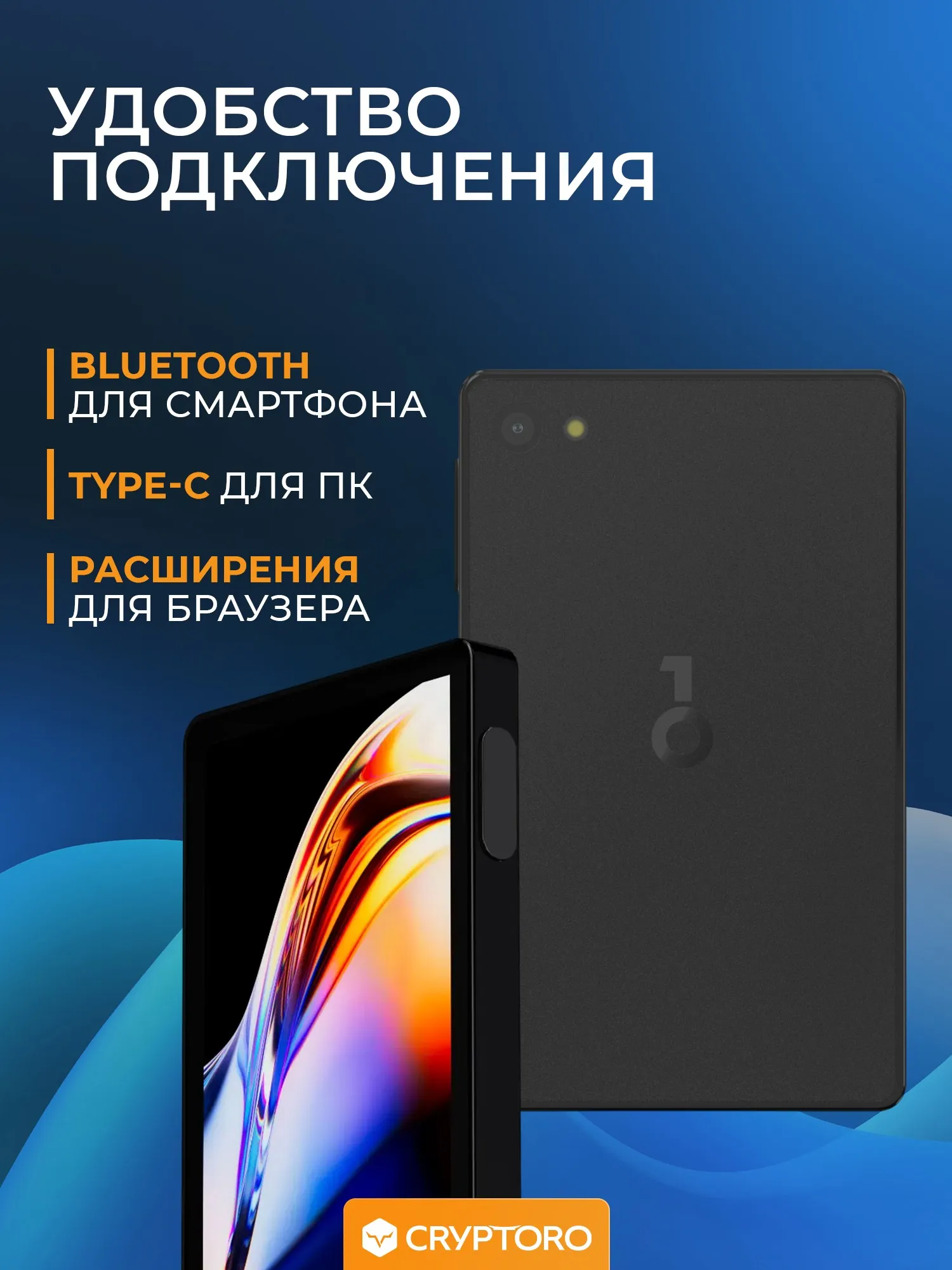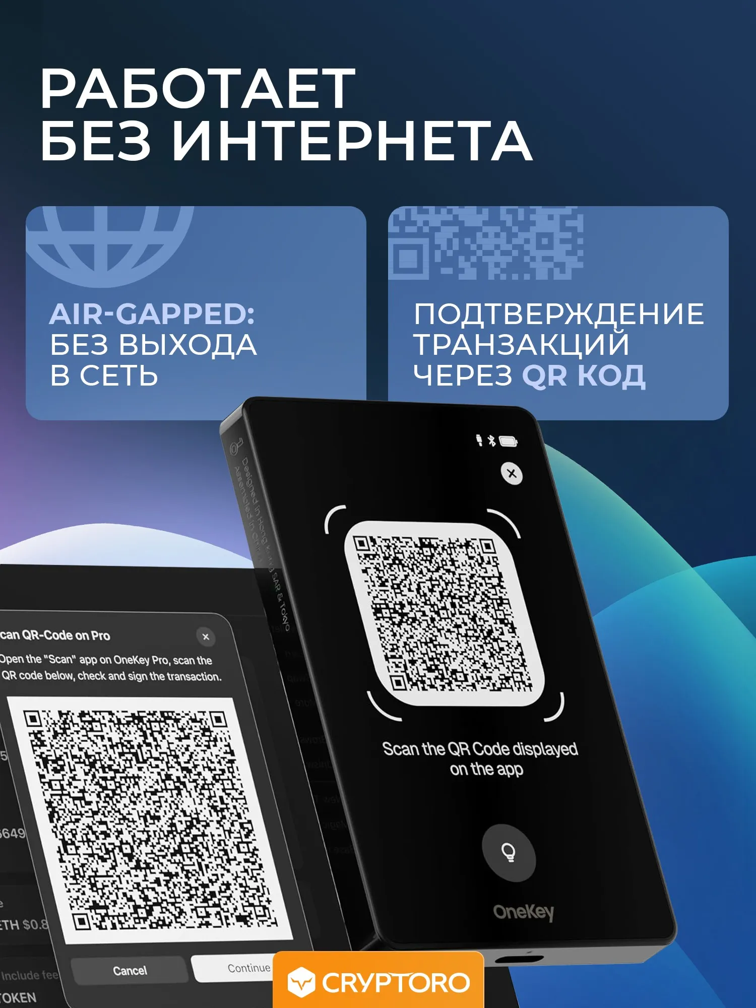 Криптокошелек имеет высокоразрешающую камеру для считывания QR-кодов и обеспечивает безопасное беспроводное подключение к внешним устройствам через WalletConnect (Air-Gapped). Встроенная вспышка позволяет считывать коды даже при недостаточном освещении.
