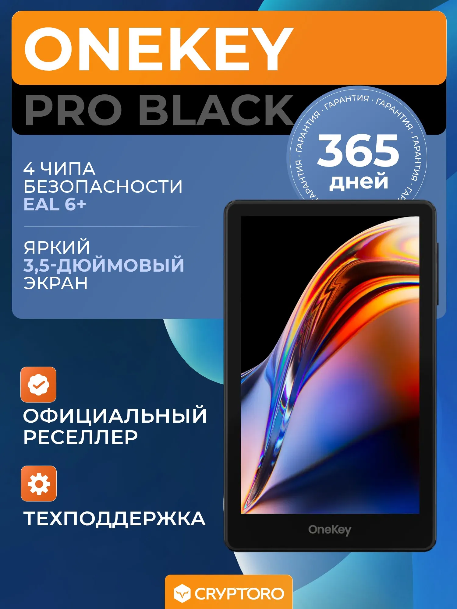 OneKey Pro внешне похож на смартфон и оснащен сенсорным дисплеем с биометрической защитой, обеспечивающей безопасный и удобный вход без необходимости ввода пароля, а также подпись транзакций одним касанием. Устройство совместимо с протоколом FIDO и функционирует как аппаратный аутентификатор (U2F-ключ), обеспечивая высокий уровень безопасности. Особенностью является возможность создания резервной копии данных с помощью карты OneKey Lite, а также наличие сканера отпечатка пальцев, для легкой разблокировки устройства.