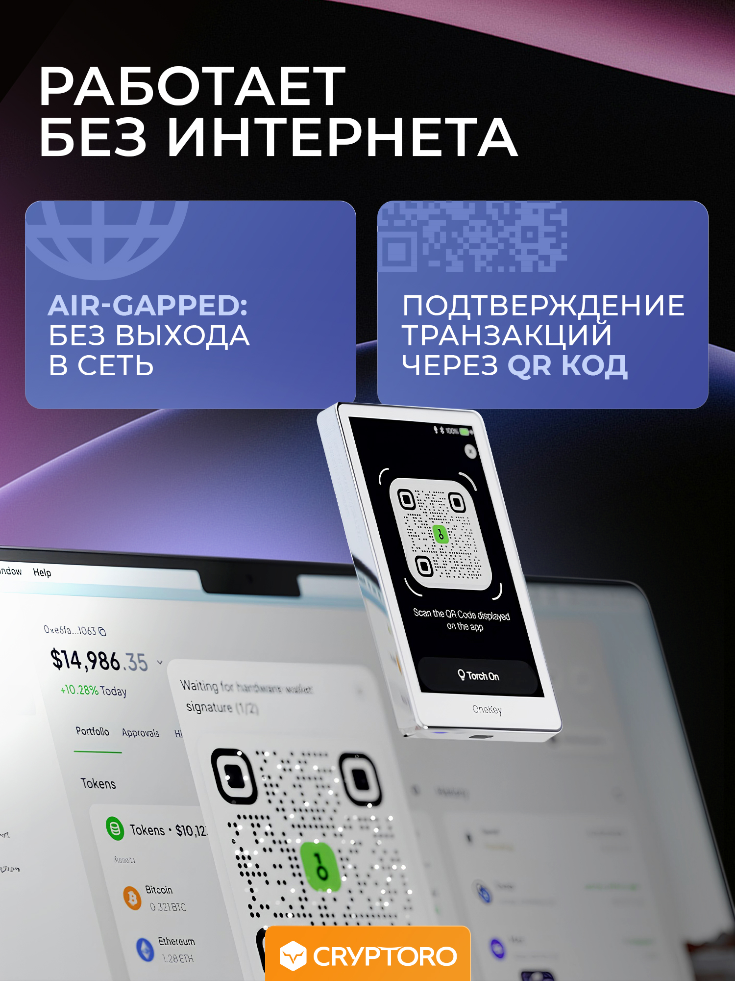 Криптокошелек имеет высокоразрешающую камеру для считывания QR-кодов и обеспечивает безопасное беспроводное подключение к внешним устройствам через WalletConnect (Air-Gapped). Встроенная вспышка позволяет считывать коды даже при недостаточном освещении.