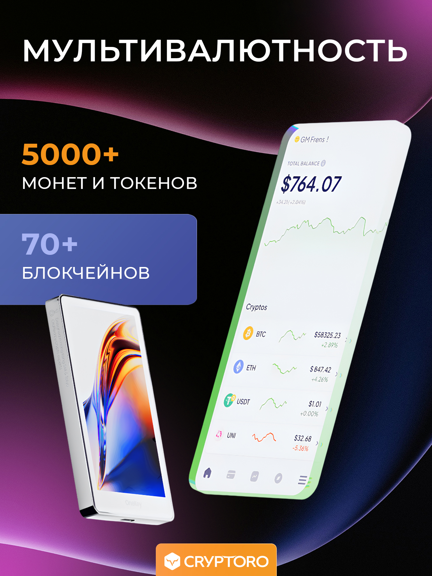 Аппаратный кошелек, 6 карточек для записи seed фразы восстановления, кабель питания Type-C - USB-A, стикер, краткое руководство (Комплектация может изменяться производителем)