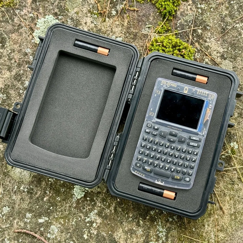 HARDCASE Q создан специально под устройство COLDCARD Q и учитывает сценарии реального использования, включая хранение устройства в офлайн-среде. Кейс вмещает сам аппаратный кошелёк и до трёх батареек, что позволяет держать всё необходимое в одном месте без риска потери аксессуаров. При этом конструкция остаётся компактной и удобной для переноски, включая поездки и длительное хранение.