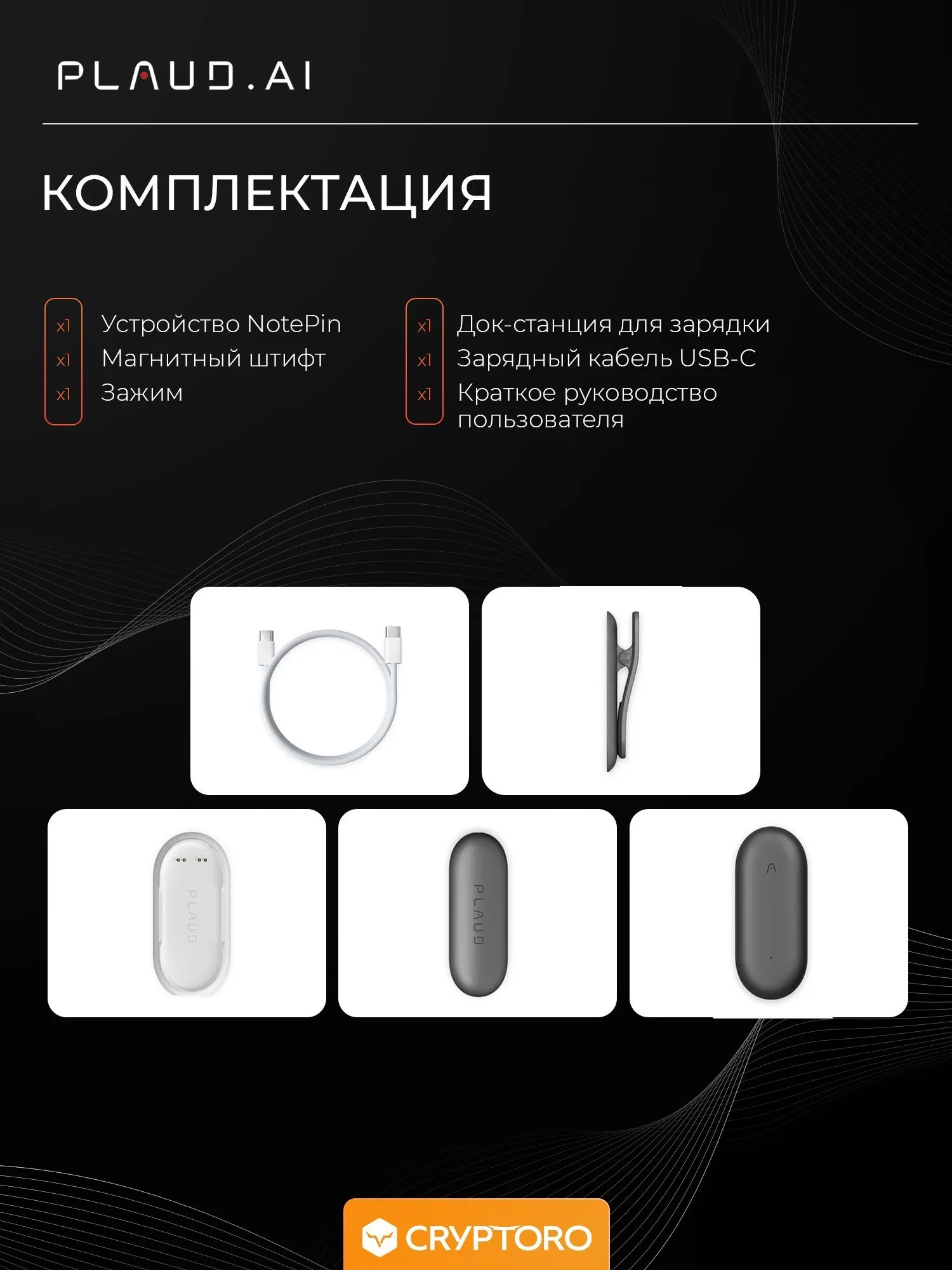 1 x Диктофон, 1 x Магнитный держатель, 1 x Клипса, 1 x Зарядная док-станция, 1 x Кабель USB-C, 1 x Краткое Руководство по эксплуатации