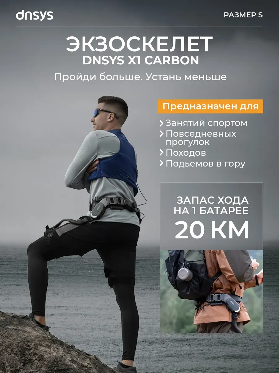DNSYS X1 Carbon — это ультралёгкий AI-управляемый экзоскелет для ног, разработанный компанией DNSYS для повышения мобильности и снижения нагрузки во время ходьбы, походов и других активностей на свежем воздухе. Размер S (линия талии 69,85 см - 89,92 см)