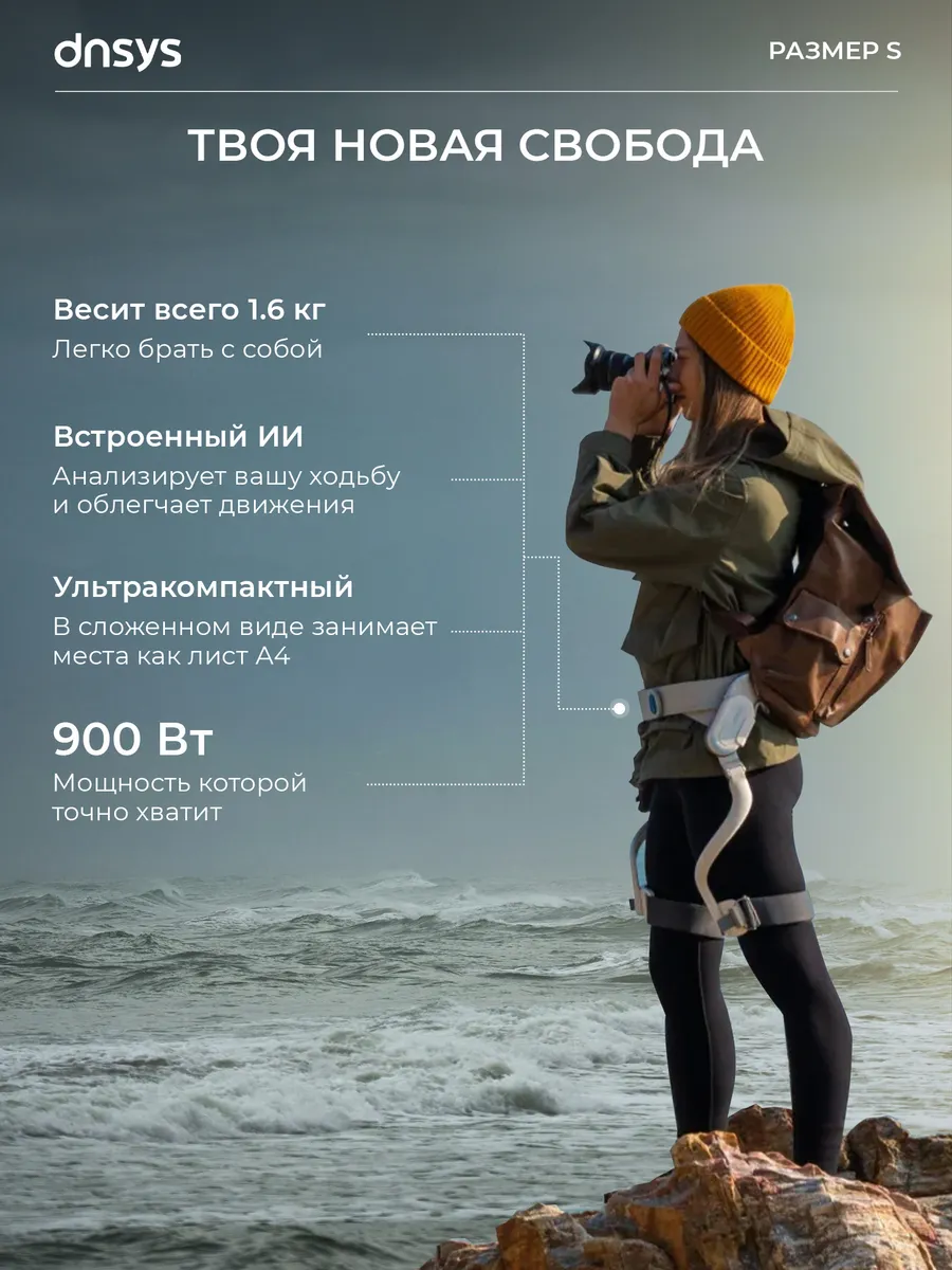Это носимое устройство, которое крепится на талию и бедра, помогая пользователям преодолевать большие расстояния с меньшими усилиями, экономя до 50% энергии и увеличивая дальность хода на 25 км. Оно идеально подходит для любителей outdoor-активностей, людей с ограниченной подвижностью (например, после операций на коленях) или тех, кто хочет усилить свои физические возможности.