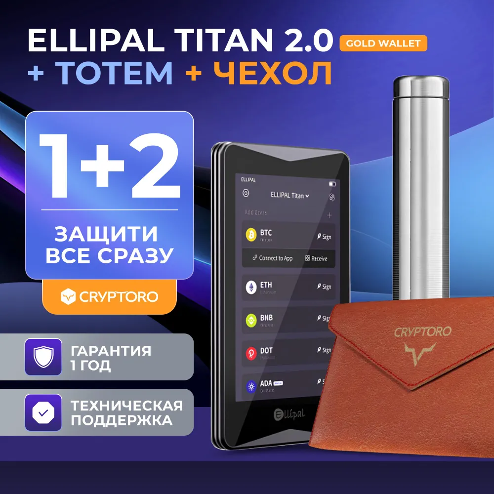 Встречайте комбо-набор от CrypToro - криптокошелек Ellipal Titan 2.0 Gold Wallet и устройство для хранения мнемонических-seed фраз Cryptoro Totem + чехол. Комплект подойдет для любителей безопасности и защиты криптоактивов или поможет познакомить членов семьи с миром криптовалют.