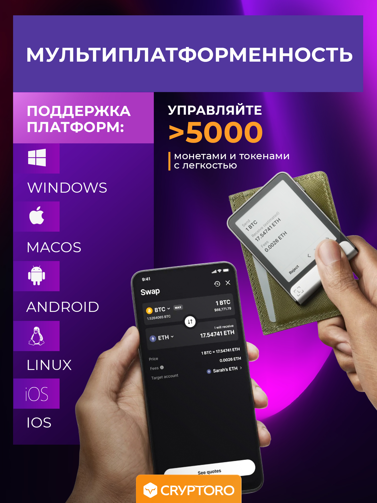 Совместимость: Работает с такими аппаратными кошельками, как Trezor, Ledger, SecuX и другими.