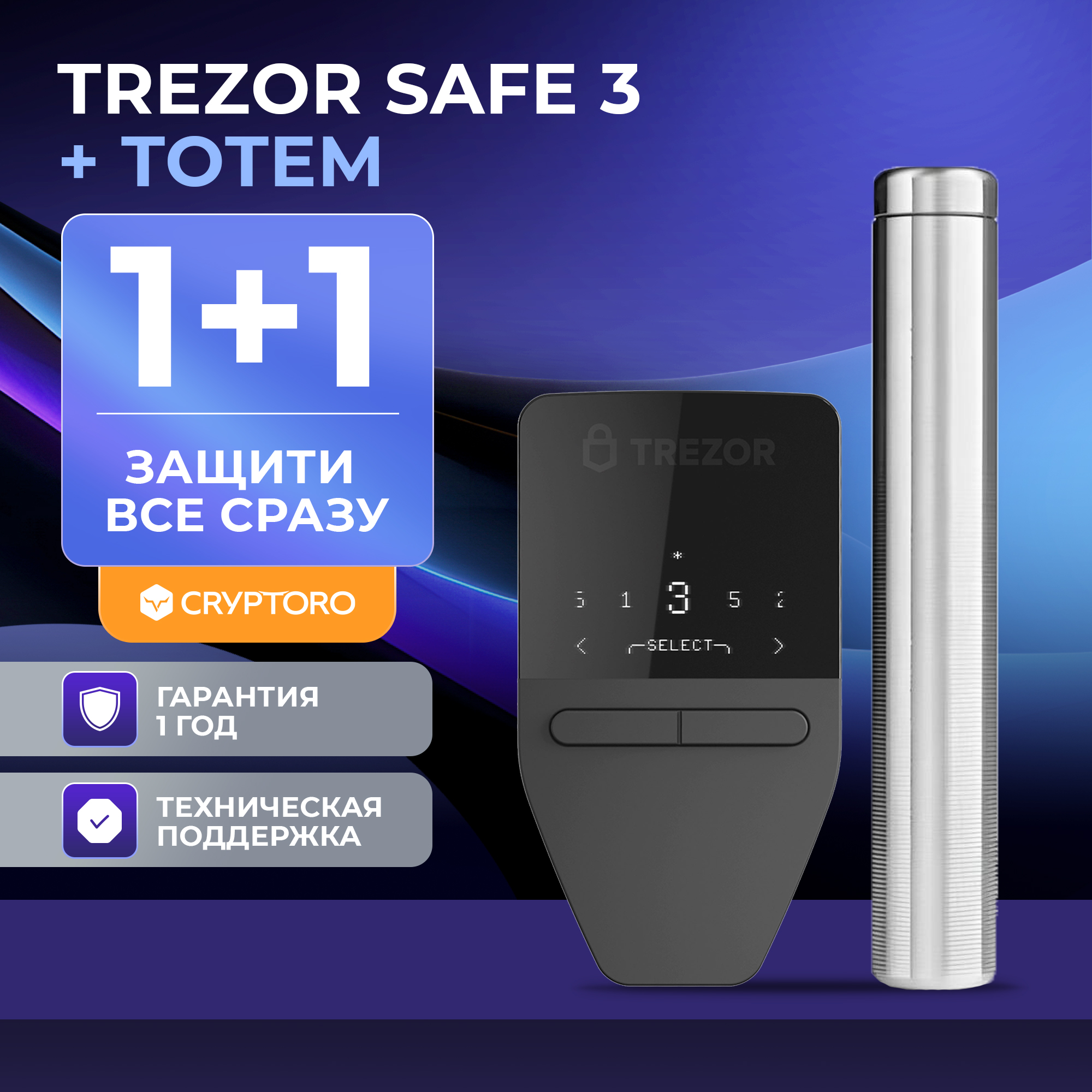 Встречайте комбо-набор от CrypToro - криптокошелек Trezor Safe 3 Cosmic Black и устройство для хранения мнемонических-seed фраз Cryptoro Totem. Комплект подойдет для любителей безопасности и защиты криптоактивов или поможет познакомить членов семьи с миром криптовалют.