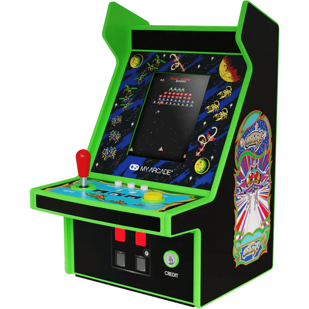 My Arcade Galaga Micro Player Pro — это компактная настольная ретро-консоль, объединяющая два легендарных космических шутера от Bandai Namco в одном устройстве. Она оснащена ярким вертикальным дисплеем диагональю 2,75 дюйма и механическими кнопками, воссоздавая аутентичный опыт аркадных залов 80-х. Это идеальный выбор для геймеров и коллекционеров, желающих насладиться классикой Galaga и Galaxian в стильном миниатюрном формате с современными функциями. Устройство выполнено в дизайне, вдохновленном оригинальным аркадным кабинетом Galaga, и снабжено полноценным аудиосопровождением через встроенный тыловой динамик. Продуманная эргономика позволяет комфортно играть часами, а наличие 3,5-мм разъема для наушников дает возможность погрузиться в процесс, не отвлекая окружающих. Версия Pro отличается от стандартных моделей улучшенной яркостью экрана и обновленным интерфейсом выбора игр. — Двойная порция ностальгии: предустановленные полные версии Galaga и Galaxian. — Гибкость питания: работа от 4 батареек типа AA или через современный разъем USB-C. — Премиальное исполнение: вертикальный экран высокого разрешения и регулируемая яркость для любого освещения.