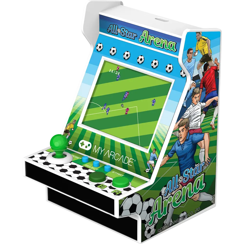 My Arcade All-Star Arena Nano Player — компактный мини-аркадный автомат с 2.4-дюймовым цветным экраном, более чем 200 встроенными ретро-играми и питанием от батареек или USB-C, который позволяет мгновенно погрузиться в классический игровой опыт Jaleco в формате настольной аркады без установки и настройки. My Arcade All-Star Arena Nano Player создан как декоративно-функциональное устройство, которое сочетает компактный размер с полноценным игровым процессом. Внутри уже предустановлены 7 официальных игр Jaleco, включая GOAL!, BASES LOADED 1–4, RACKET ATTACK и HOOPS, а также более 200 дополнительных ретро-игр, что делает устройство готовым к использованию сразу после включения. Мини-формат корпуса (в стиле классического аркадного автомата) делает его не только игровой консолью, но и элементом интерьера для рабочего стола, игровой комнаты или коллекции. Эргономичная конструкция оптимизирована для длительных игровых сессий, несмотря на компактные размеры, а встроенный динамик с регулировкой громкости позволяет играть без наушников. Устройство поддерживает два варианта питания — от 4 батареек AAA или через кабель USB-C, что делает его удобным как для стационарного использования, так и для переноски. Благодаря этому Nano Player можно использовать в дороге, на работе или дома без привязки к розетке.