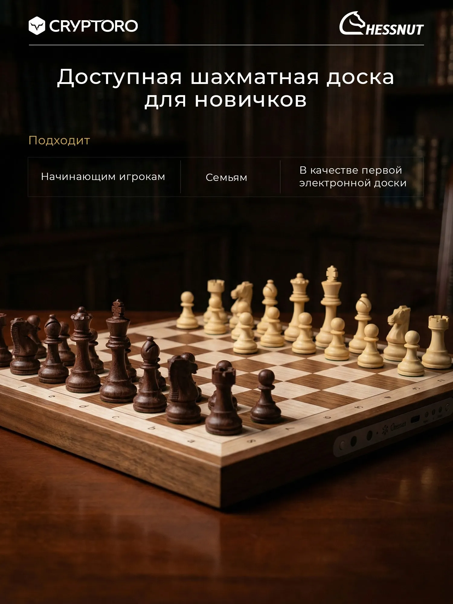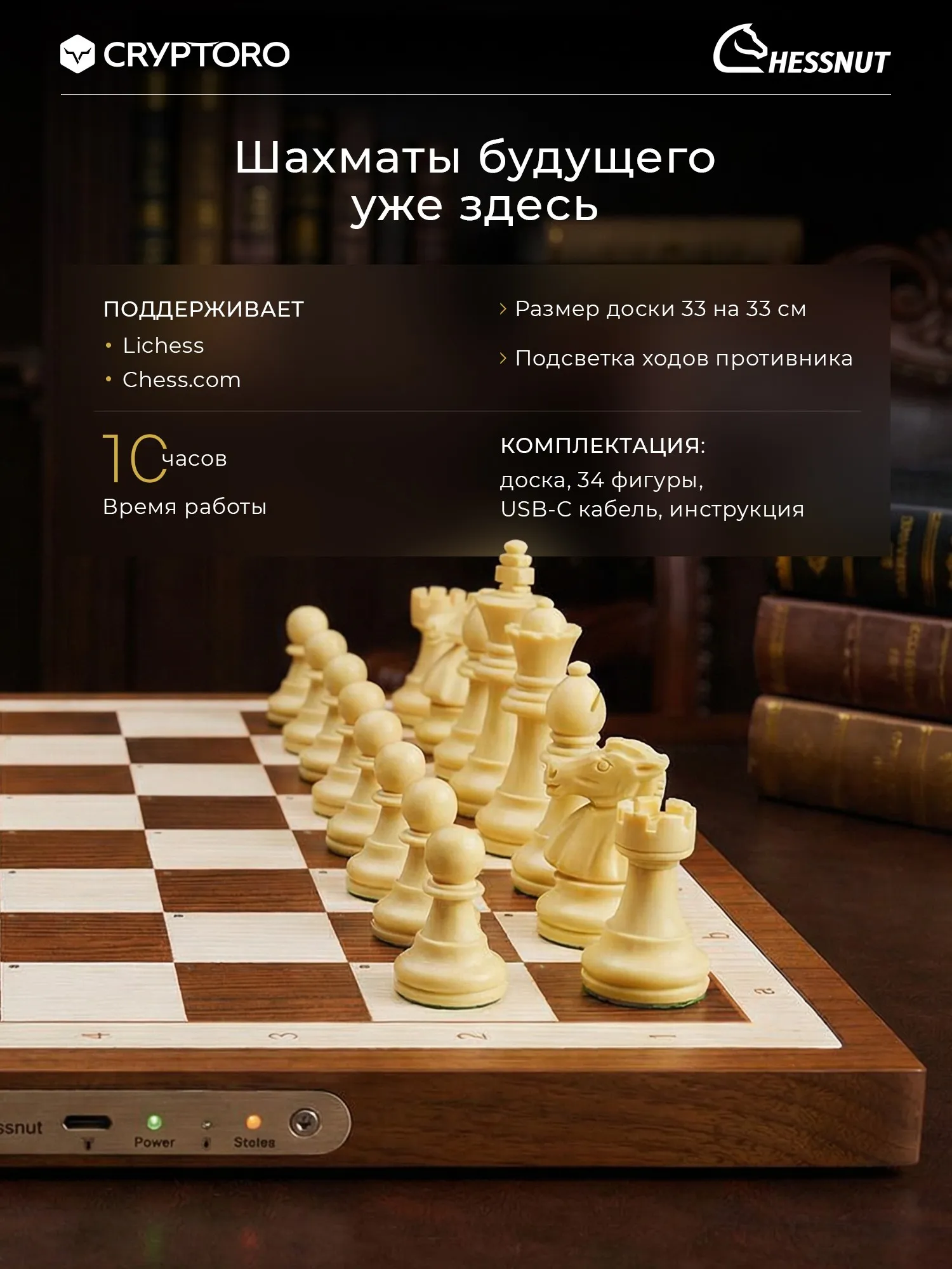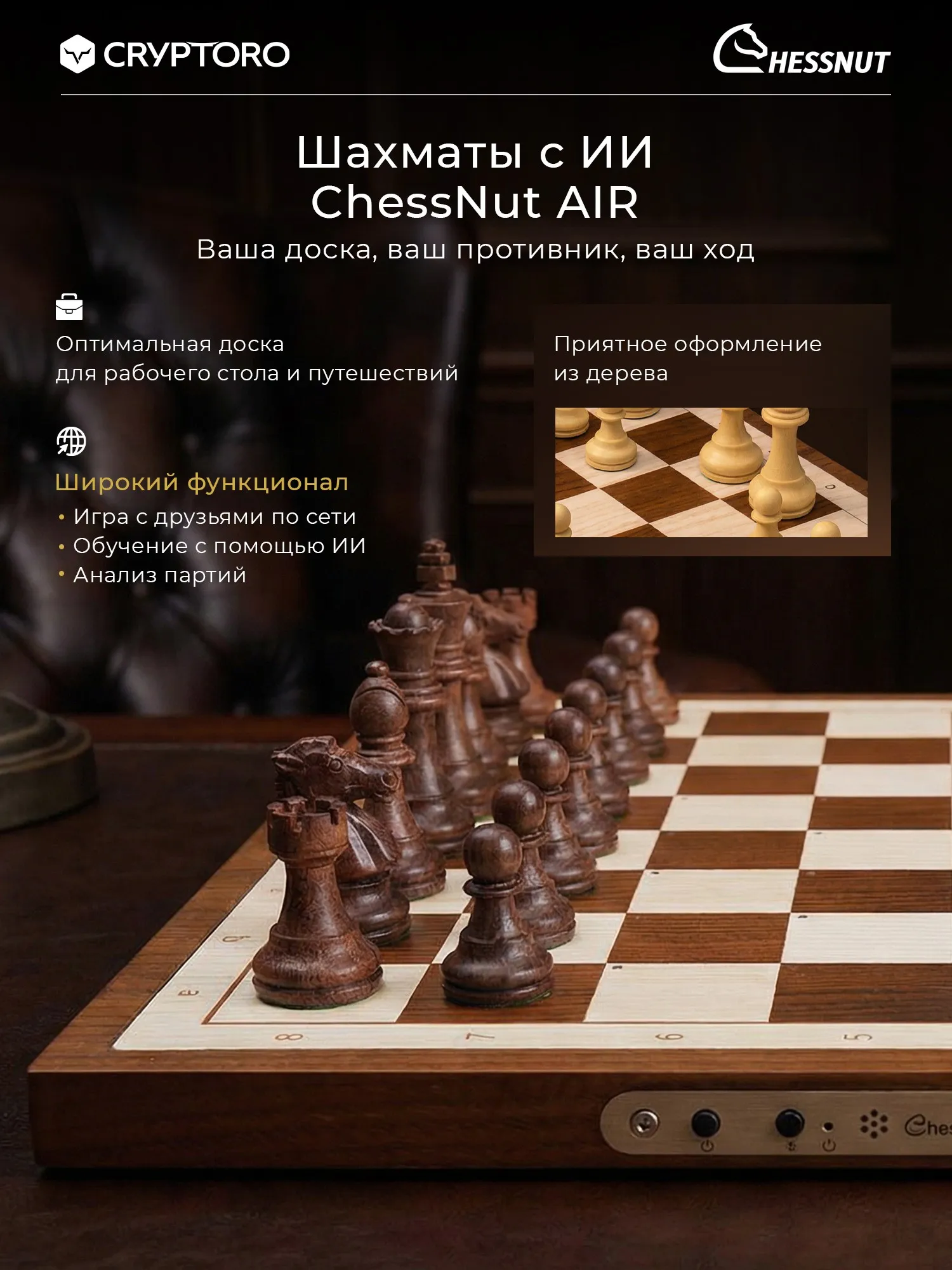 Chessnut Air — умная электронная доска с деревянной отделкой, объединяющая классическую игру и современные технологии. Благодаря встроенным сенсорам и Bluetooth, вы можете сражаться с миллионами игроков на Lichess и Chess.com или тренироваться с AI. Светодиодная подсветка подскажет ход соперника, а функция распознавания фигур мгновенно оцифрует позицию. Идеальный компактный инструмент для анализа, игры и обучения в любом месте.