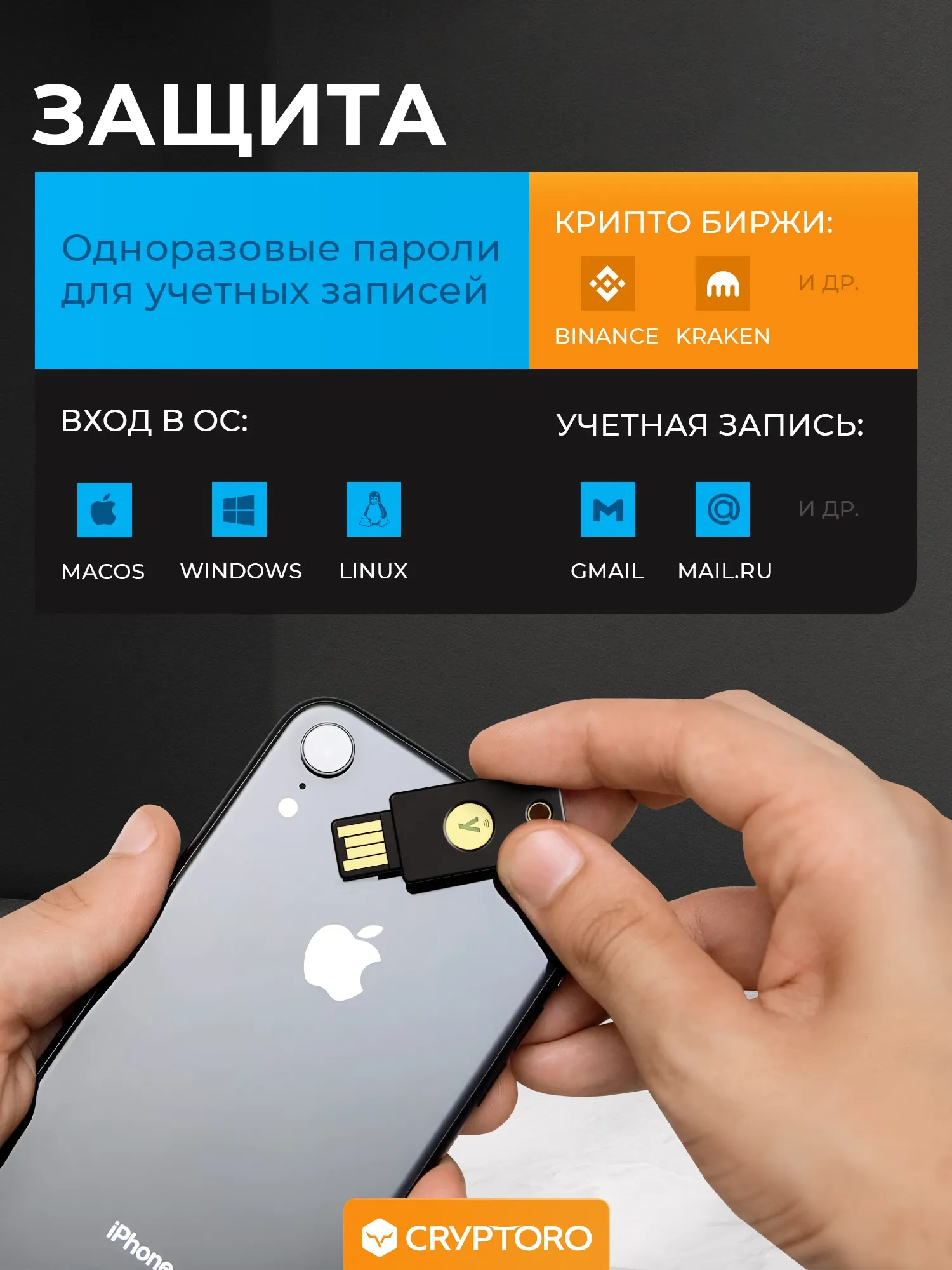Yubikey 5 NFC — это аппаратный ключ, обеспечивающий безопасный доступ к вашим учетным записям. Устройство поддерживает как стандартное подключение через USB-A, так и бесконтактную авторизацию благодаря встроенной технологии NFC. Это делает его особенно удобным для использования как на компьютере, так и на смартфоне. Ключ создан для двухфакторной и многофакторной аутентификации. Он совместим с широким спектром сервисов: от почты и социальных сетей до корпоративных систем и криптовалютных кошельков. Юбикей 5 НФС поддерживает протоколы FIDO2, U2F, OTP, PIV и Smart Card, что позволяет использовать его в различных сценариях — от входа в аккаунты до подписания электронных документов. Устройство не требует установки дополнительного программного обеспечения: всё работает "из коробки". Достаточно вставить ключ в USB-порт или поднести его к смартфону с поддержкой NFC — авторизация произойдёт за доли секунды. Это особенно важно для пользователей, ценящих скорость и удобство в повседневной работе. Металлический корпус защищает ключ от повреждений, а сама конструкция рассчитана на многолетнюю эксплуатацию. Даже при регулярном использовании устройство сохраняет работоспособность, не теряет чувствительности и не требует обновлений. Благодаря компактности ключ можно носить с собой на связке с обычными ключами. Yubikey 5 NFC помогает свести к нулю риск фишинга, подбора паролей и других видов атак. Он создаёт защищённый канал между пользователем и системой, исключая возможность перехвата данных даже при попытке внешнего вмешательства. Это особенно актуально для тех, кто хранит конфиденциальную информацию или работает с удалёнными корпоративными платформами. Оригинальные устройства доступны с доставкой по всей России. Вы также можете получить товар самовывозом в Москве или проконсультироваться с нашими специалистами перед покупкой. Другие популярные решения включают: Trezor Safe 5, Trezor Model One, SafePal S1, SafePal S1 Pro, SafePal X1, Ellipal Titan 2.0, Ellipal Titan Mini, OneKey Pro, OneKey Classic 1S, OneKey Classic 1S Pure, SecuX V20, SecuX W20, SecuX W10.