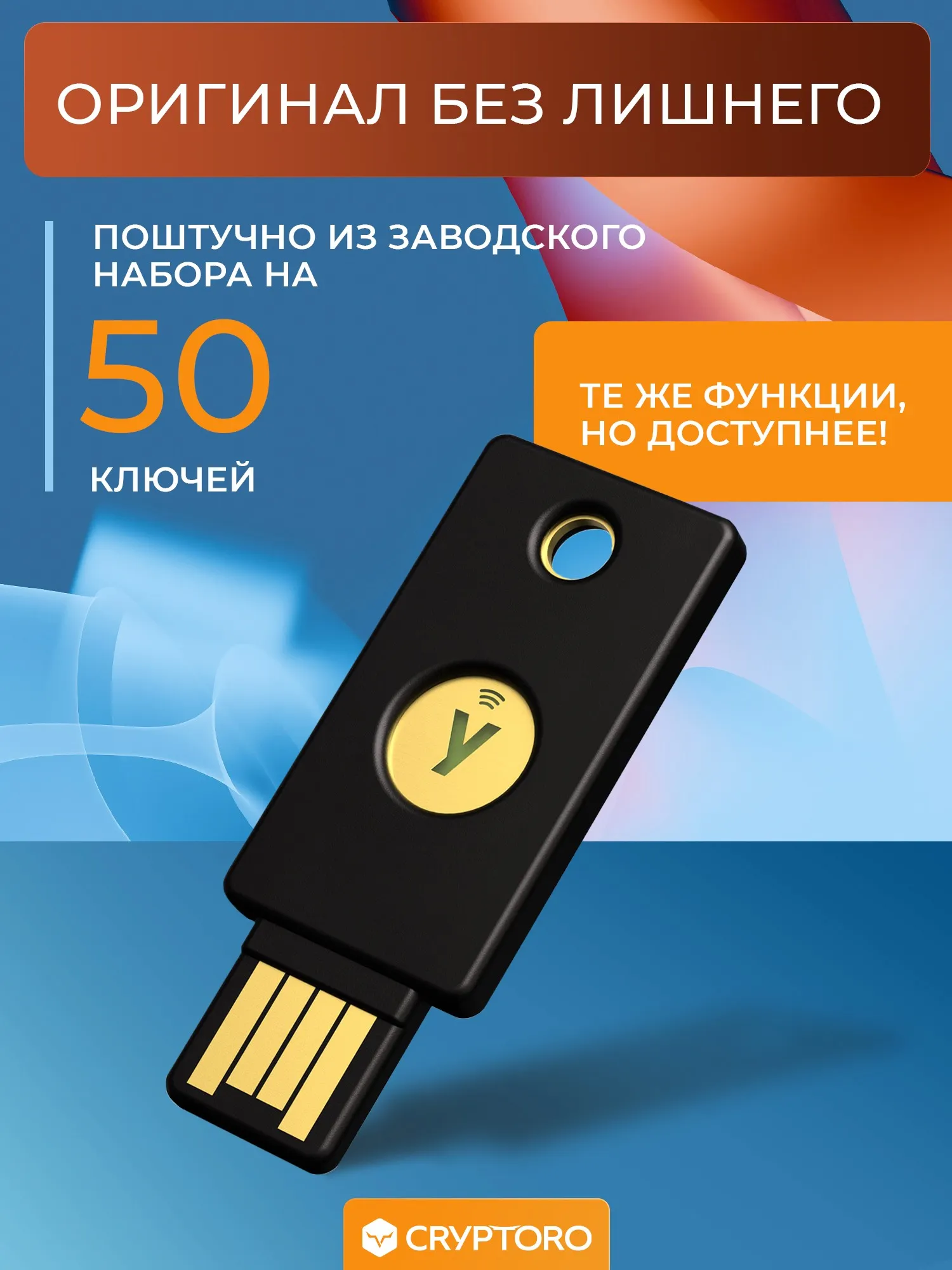 В ассортименте доступны множество ключей Yubikey, например Yubikey 5, Yubikey 5 NFC, Yubikey 5C NFC, Yubikey 5С Nano, Yubikey 5 Nano, Yubikey 5Ci для вашего iPhone, Yubikey Security Key NFC USB-А и Type C, а так же ключи с биометрией YubiKey Bio USB-A и Type-C. Для безопасного хранения ключей рекомендуем использовать водонепроницаемую алюминиевую чехол-капсулу CRYPTORO CAPSULE.