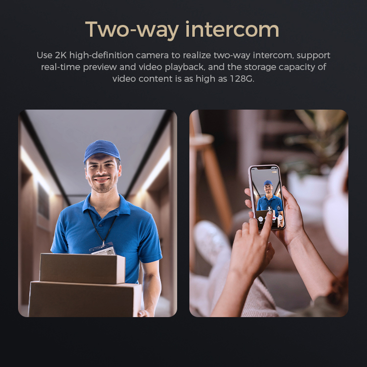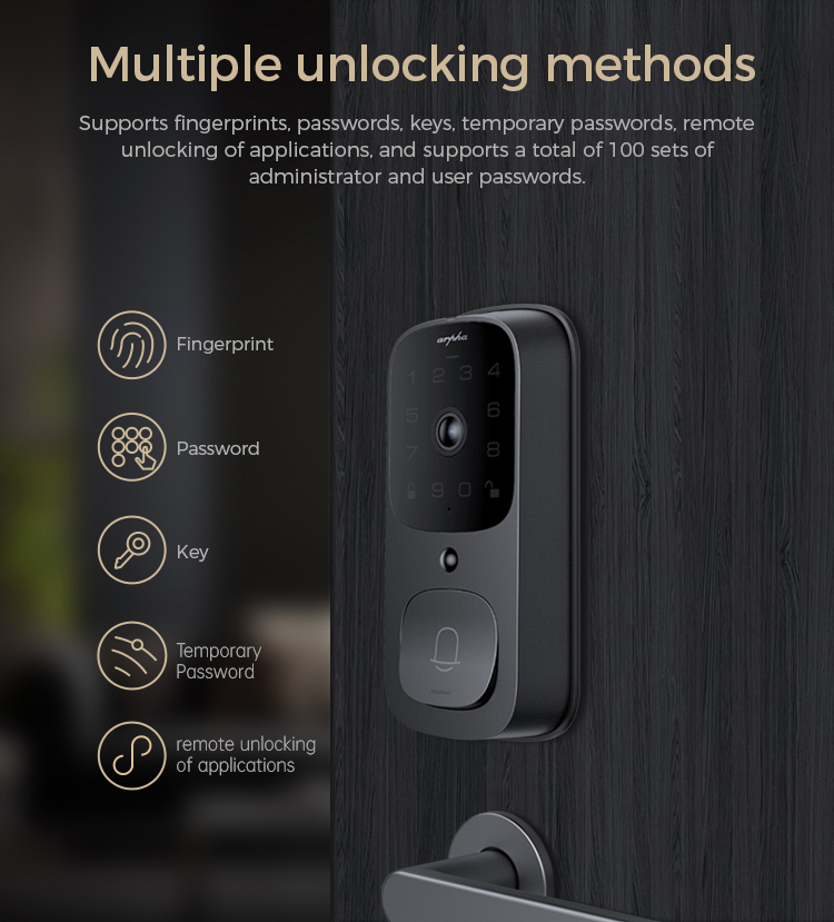 Умный замок с камерой: Замок включает Wi-Fi, 2K HD камеру и дверной звонок с углом обзора 180°. Поддерживается формат изображений 4:3.