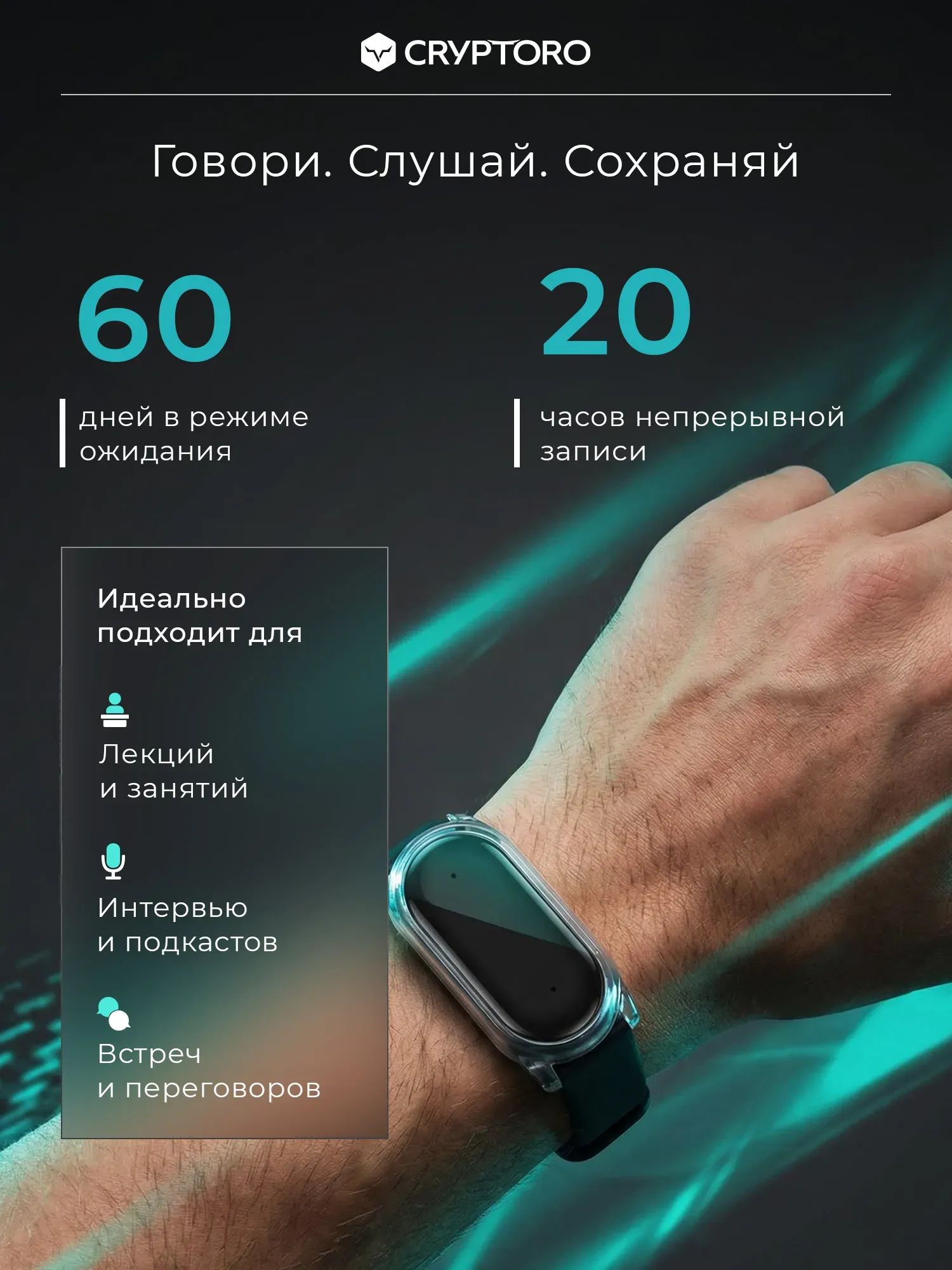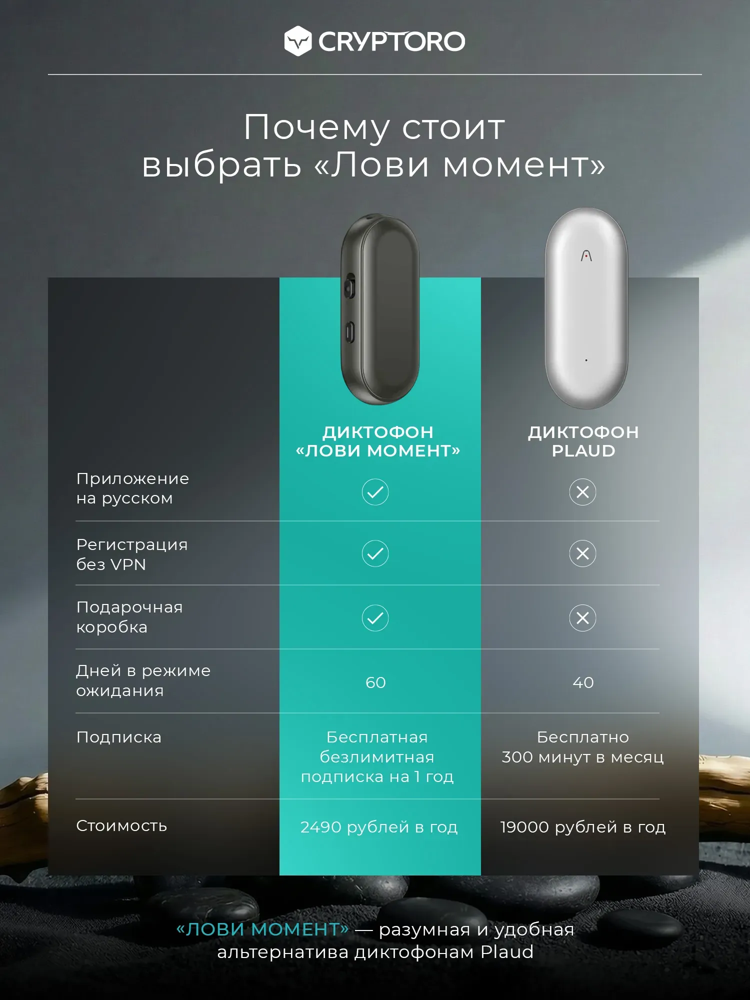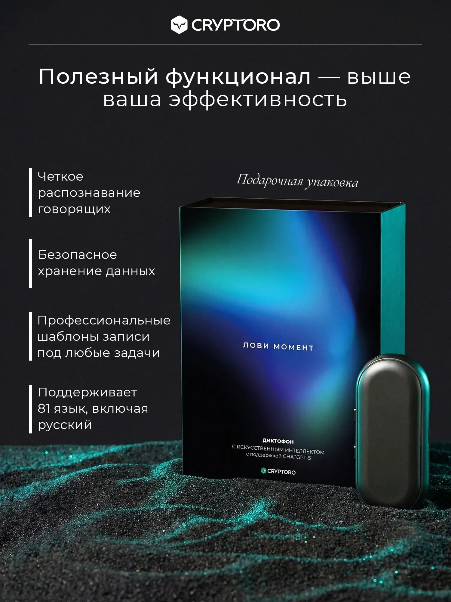 Умный диктофон с искусственным интеллектом для записи и транскрипции разговоров "Лови Момент" от компании CRYPTORO.
