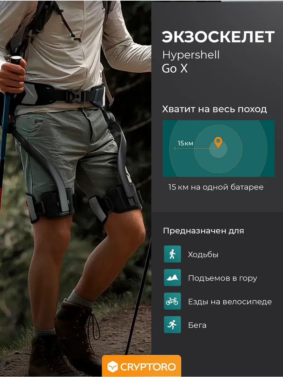 Экзоскелет Hypershell Go X — это компактное носимое устройство, разработанное шанхайской компанией Hypershell для активного отдыха, туризма и повседневных приключений. Модель ориентирована на путешественников, туристов и любителей активного образа жизни, помогая снизить нагрузку на ноги, компенсировать вес тяжелого рюкзака (до 30 кг) и повысить выносливость при ходьбе, беге или подъеме по пересеченной местности. Устройство весит около 2 кг, регулируется по размеру талии и оснащено складной конструкцией, что позволяет компактно размещать его в рюкзаке (объем в сложенном виде — 6,5 литров). Hypershell Go оснащен электродвигателем, литиевыми батареями с возможностью быстрой замены и интеллектуальной системой управления с искусственным интеллектом (ИИ), которая адаптируется к походке пользователя в реальном времени. Экзоскелет имеет защиту от влаги (IP54) и работает при температурах до -20°C, что делает его подходящим для использования в сложных погодных условиях.