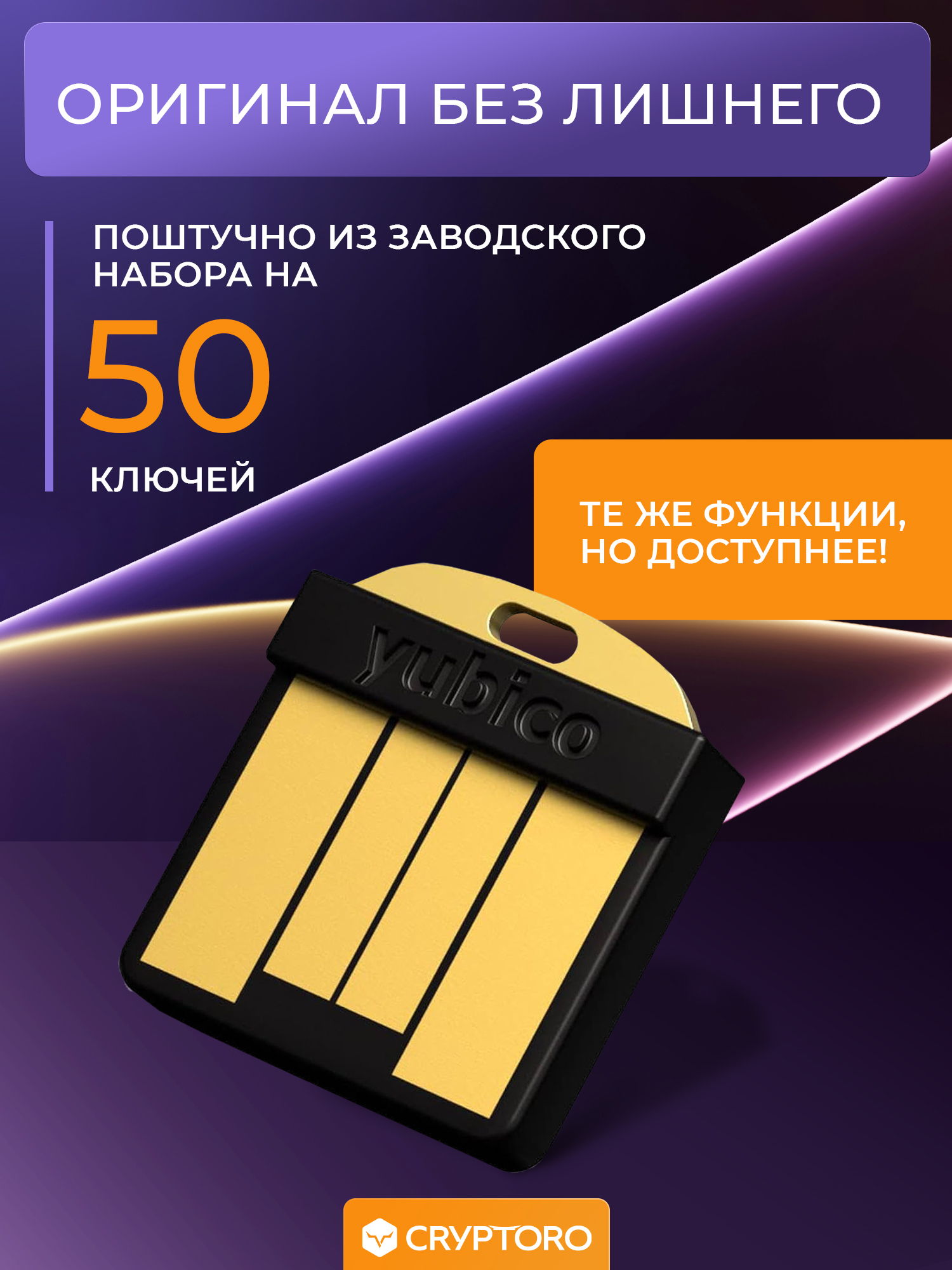 В ассортименте доступны множество ключей Yubikey, например Yubikey 5, Yubikey 5 NFC, Yubikey 5C NFC, Yubikey 5С Nano, Yubikey 5 Nano, Yubikey 5Ci для вашего iPhone, Yubikey Security Key NFC USB-А и Type C, а так же ключи с биометрией YubiKey Bio USB-A и Type-C. Для безопасного хранения ключей рекомендуем использовать водонепроницаемую алюминиевую чехол-капсулу CRYPTORO CAPSULE.